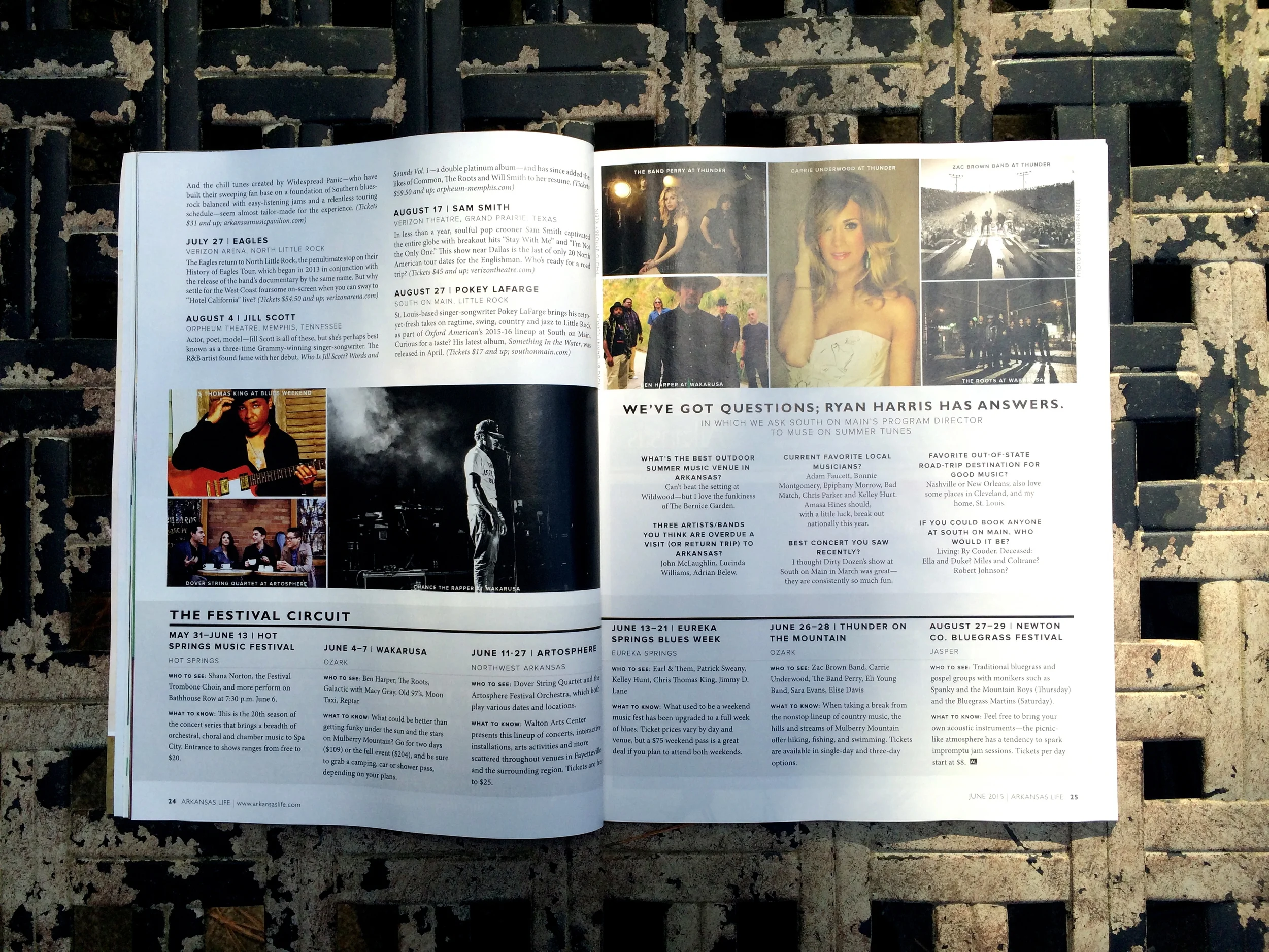 My contribution to the June issue of Arkansas Life was a summer guide to all sorts of musical happenings going on around the state. In addition to local gigs at venues such as Verizon Arena and Rev Room, I included shows that are just beyond Arkansas's borders, like Sam Smith's tour closer in Grand Prairie, Texas, in August. Also: Information on Wakarusa, Artosphere, and other statewide music fests, plus a super-short Q&A with Ryan Harris, program director at South on Main.